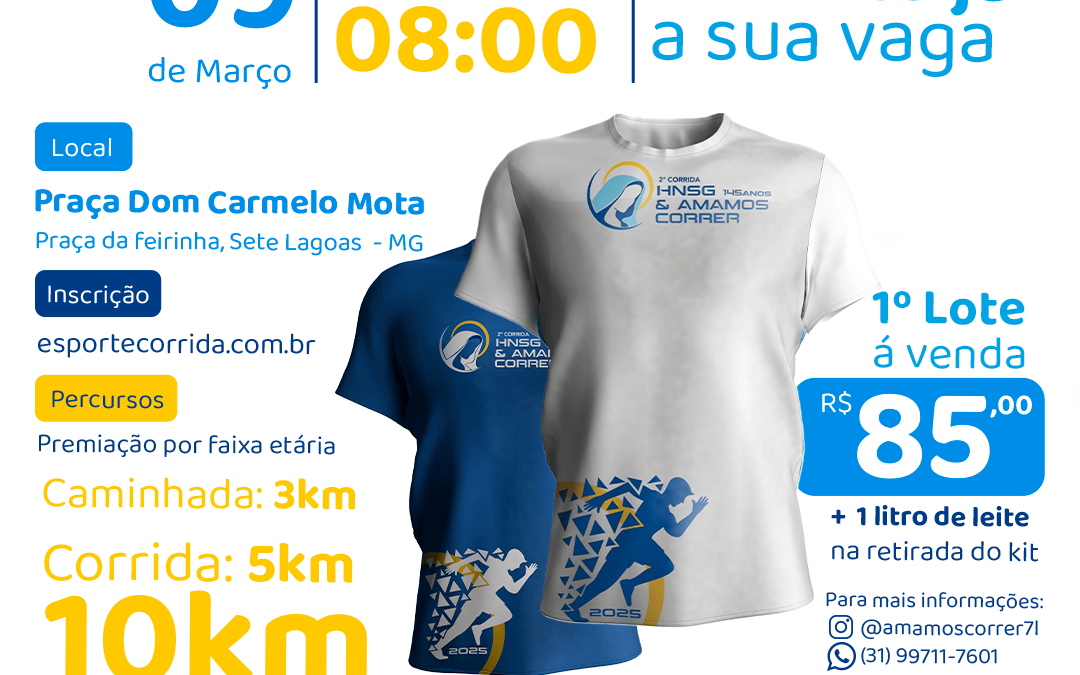O Hospital Nossa Senhora das Graças (HNSG), em comemoração aos seus 145 anos de história e dedicação à saúde, realiza a 2ª Corrida HNSG & Amamos Correr no dia 9 de março de 2025, com largada às 8h, na Praça Dom Carmelo Mota, conhecida como Praça da Feirinha, em Sete Lagoas – MG.