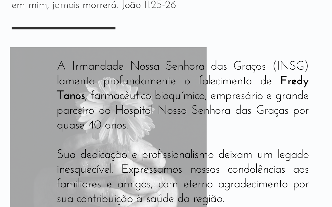 A Irmandade Nossa Senhora das Graças (INSG), por meio do Conselho de Administração, Diretoria e colaboradores, lamenta profundamente o falecimento de Fredy Tanos, farmacêutico bioquímico, empresário e, principalmente, grande parceiro do Hospital Nossa Senhora das Graças (HNSG).